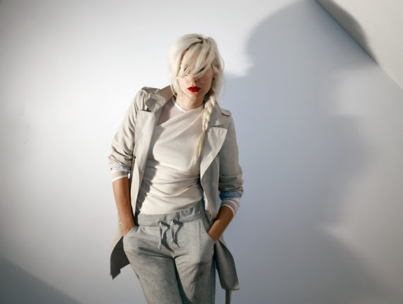 i wear: sheer white dress: american apparel, nude one shoulder dress: american apparel, trench: zara, sweats: h&m, shoesies: jeffrey campbell